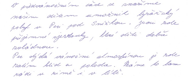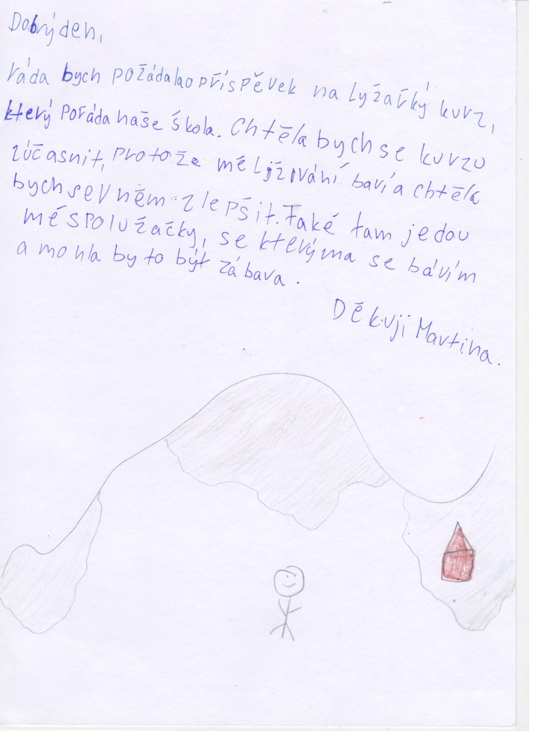 Na lyžák vyjíždíme každoročně na Klínovec v Krušných horách. Máme to tam rádi. Bezvadně si zalyžujeme na upravených sjezdovkách a máme ubytování v hotelu Berghoff se skvělou kuchyní. Vaří pan Jarda a opravdu nám dopřává. Pobyt na horách obvykle spojíme i s návštěvou bazénu, muzea v Jáchymově a Krušnohorské apatiky. Před odjezdem trénujeme na malé sjezdovce v Českém Jiřetíně, abychom pohyb na velkých sjezdovkách zvládli. V rámci přípravy se učíme lyžařské dovednosti a pravidla bezpečného pohybu na svahu i na lanovce a vleku. Lyžování nás baví a spojuje.