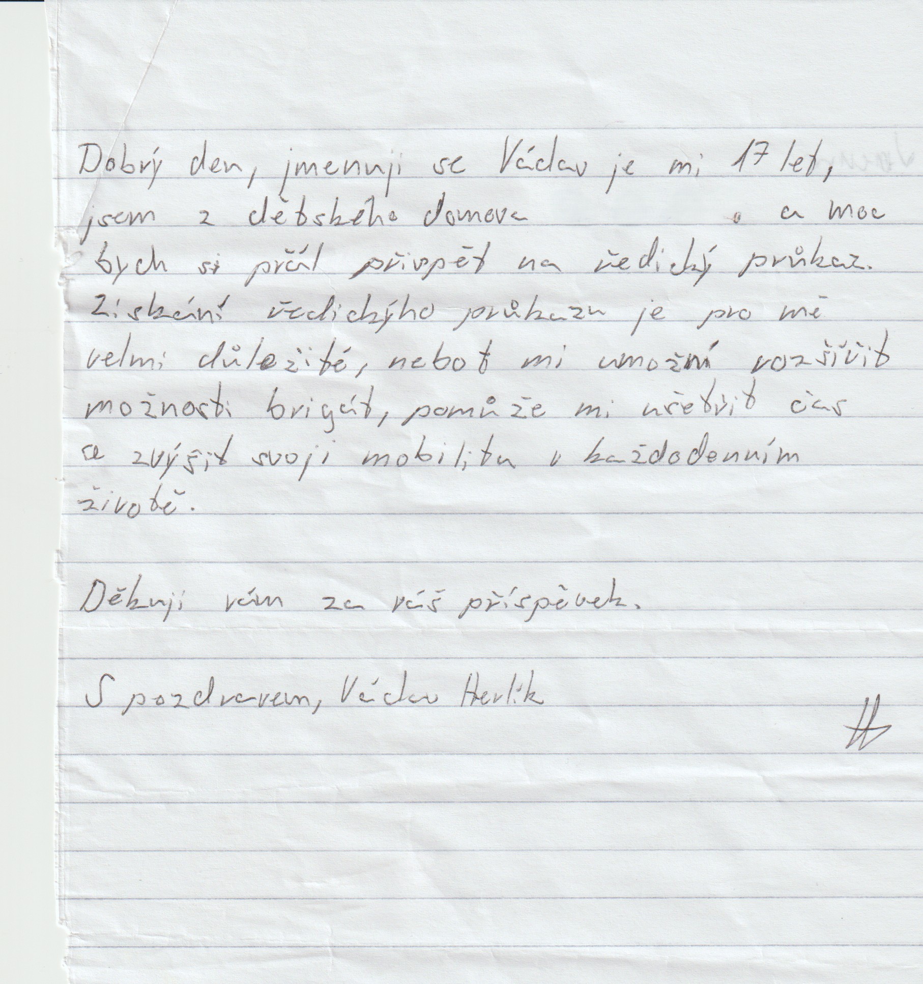 Vašek vyrůstá v domově od svých 6 let. Je to velmi klidný chlapec, je spolehlivý, samostatný, kamarádský a žije ve startovacím bytě. Rád lyžuje, chodí na brigády. Nastoupil do 1. ročníku SPŠD v Plzni. Pro děti je Vašek vzorem. Řidičské oprávnění touží mít od svých 15 let. Pro Vaška by byl řidičák dalším krokem k nezávislosti a startu do samostatného života.
