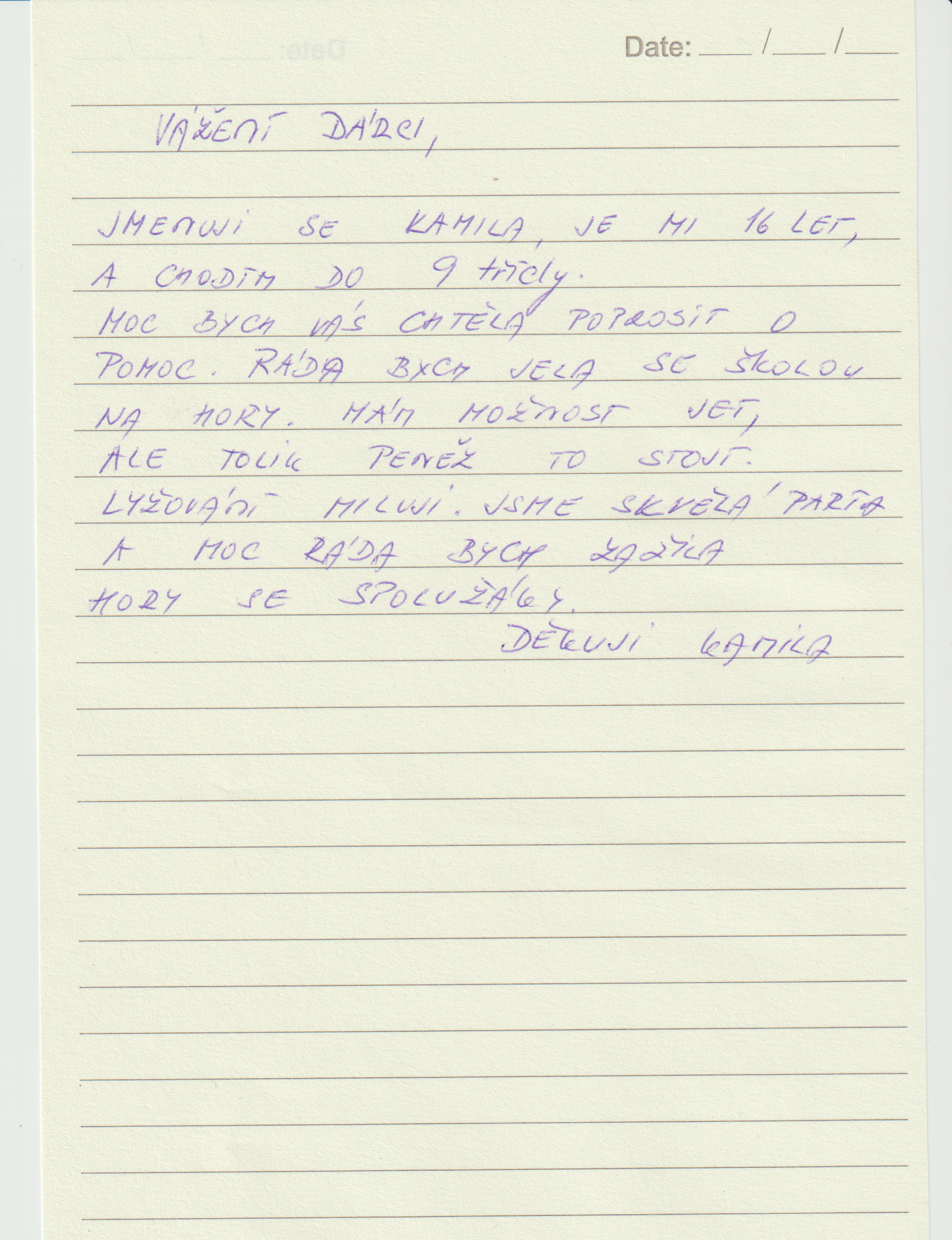 Kamila je vesměs klidné povahy, pomáhá s péčí o své 4 sourozence. Je kamarádská. Je to šestnáctiletá dívka, nejstarší z pěti sourozenců. Ve škole dosahuje průměrných výsledků, je snaživá, připravuje se do učení. Ve svém volném čase pracuje jako asistent trenéra na sportovním kroužku. Žije se sourozenci v domečku, kde tetám pomáhá s péči o bratry, s vařením i praním. Hory bychom jí rádi dopřáli. Od doby, kdy se naučila lyžovat, ji hory lákají hodně.
