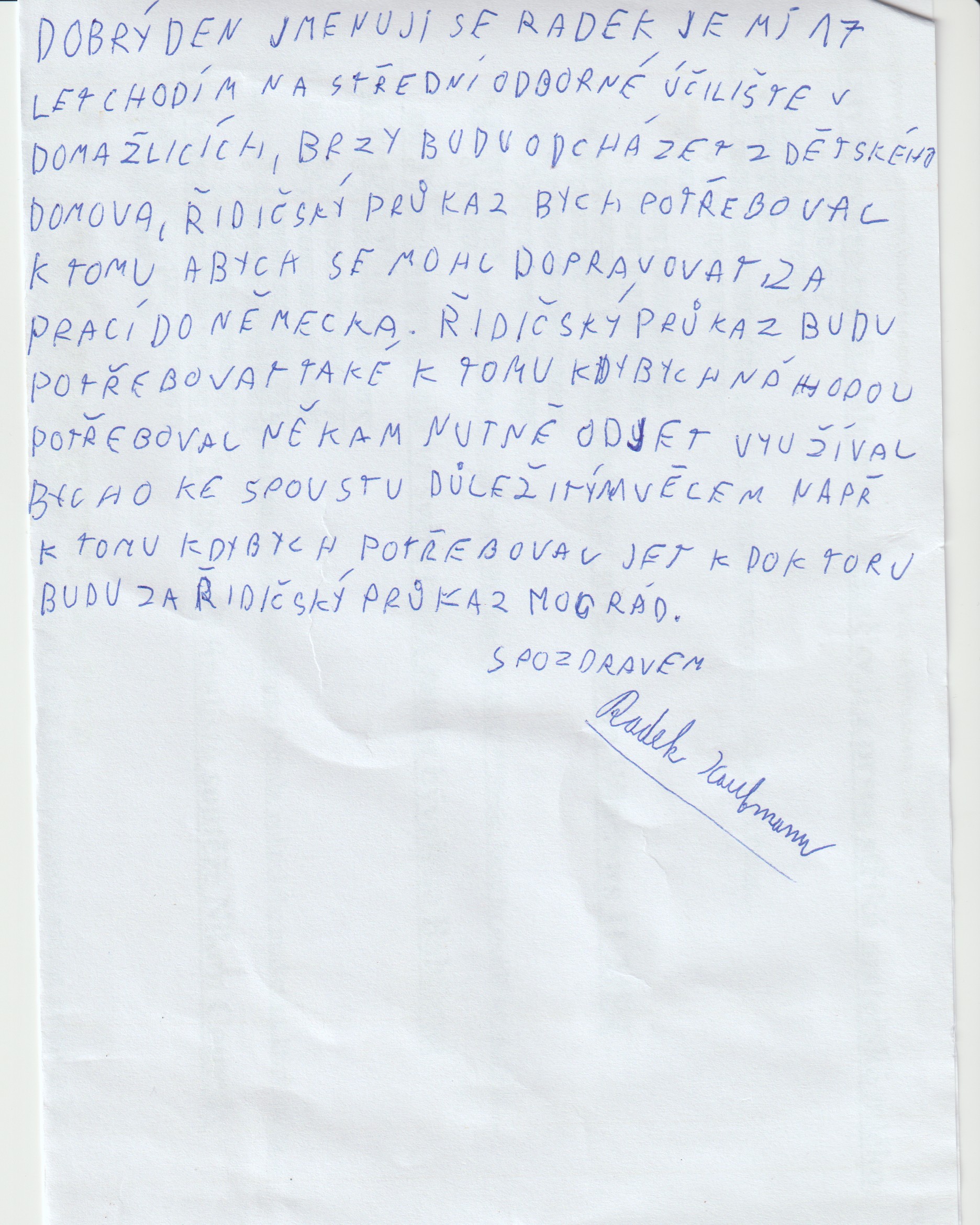 Radek je klidný, samostatný, veselý chlapec, který pomáhá tetám a strejdům. Je vzorem pro mladší děti. Hodně přemýšlí o své budoucnosti a chápe, že řidičák je krokem k jeho budoucímu samostatnému životu. Radek hodně dozrál, dost se zabývá svojí budoucností. V domově je naprosto bez výchovných potíží a tím je vzorem pro ostatní děti.